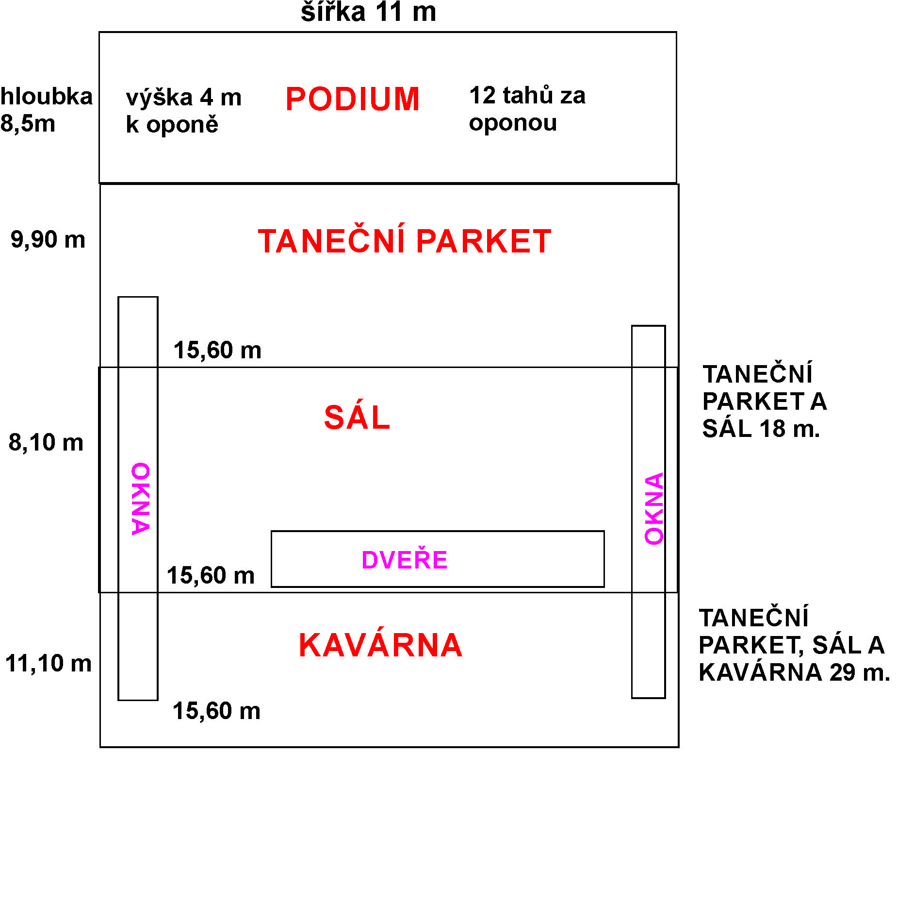 Variabilní uspořádání sálu na několik způsobů, stolové nebo klasicky divadelní pronájem salónků | |